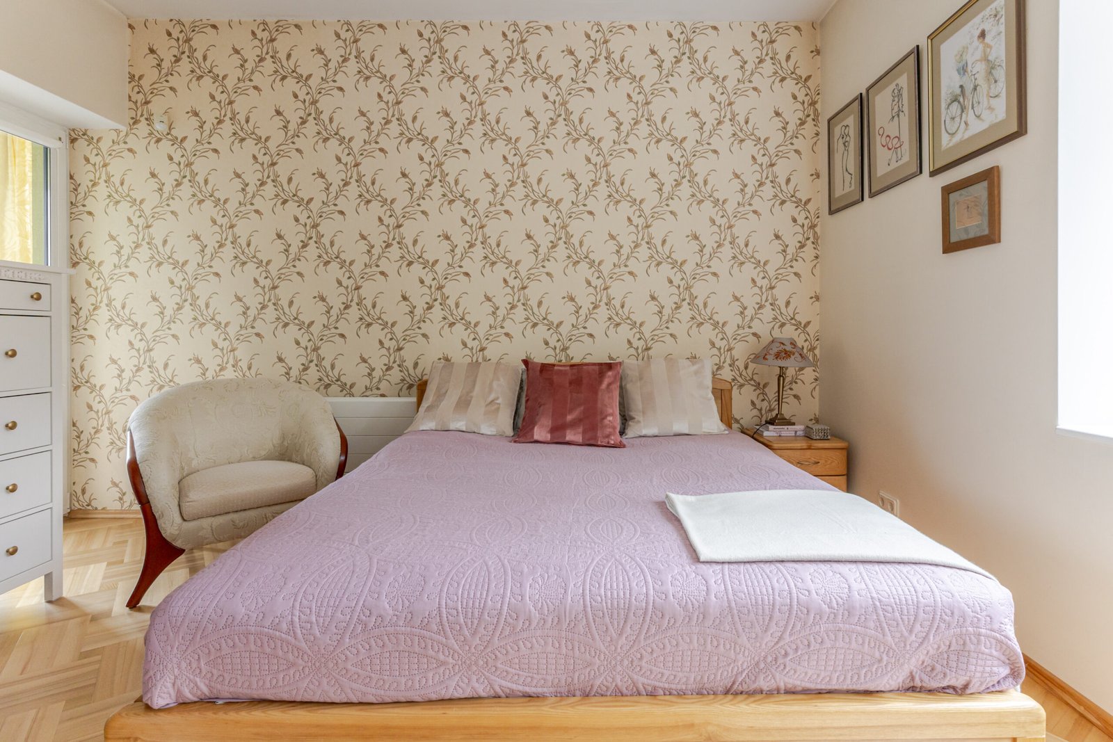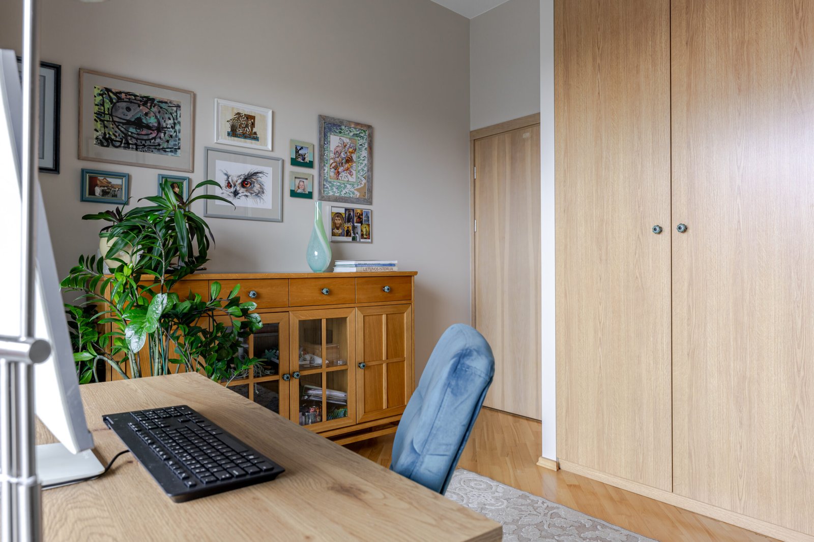 Sienos – dažytos, dalis sienų dekoruotos tapetais.