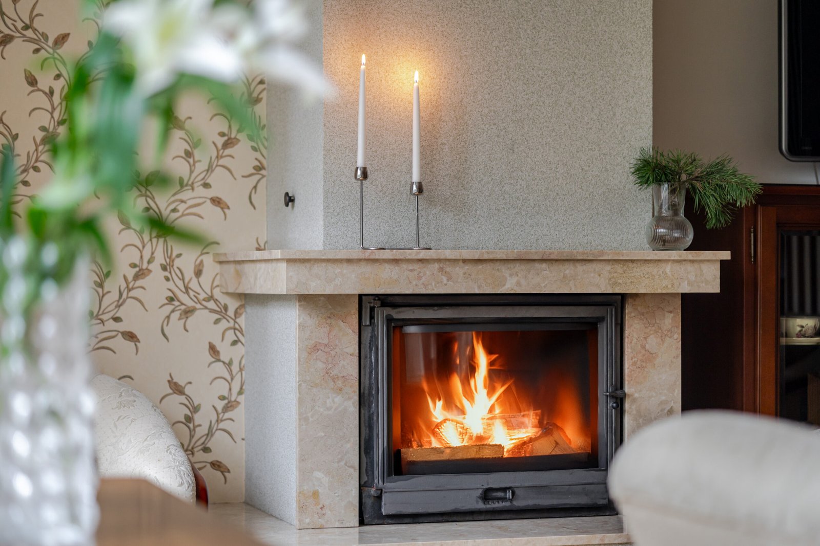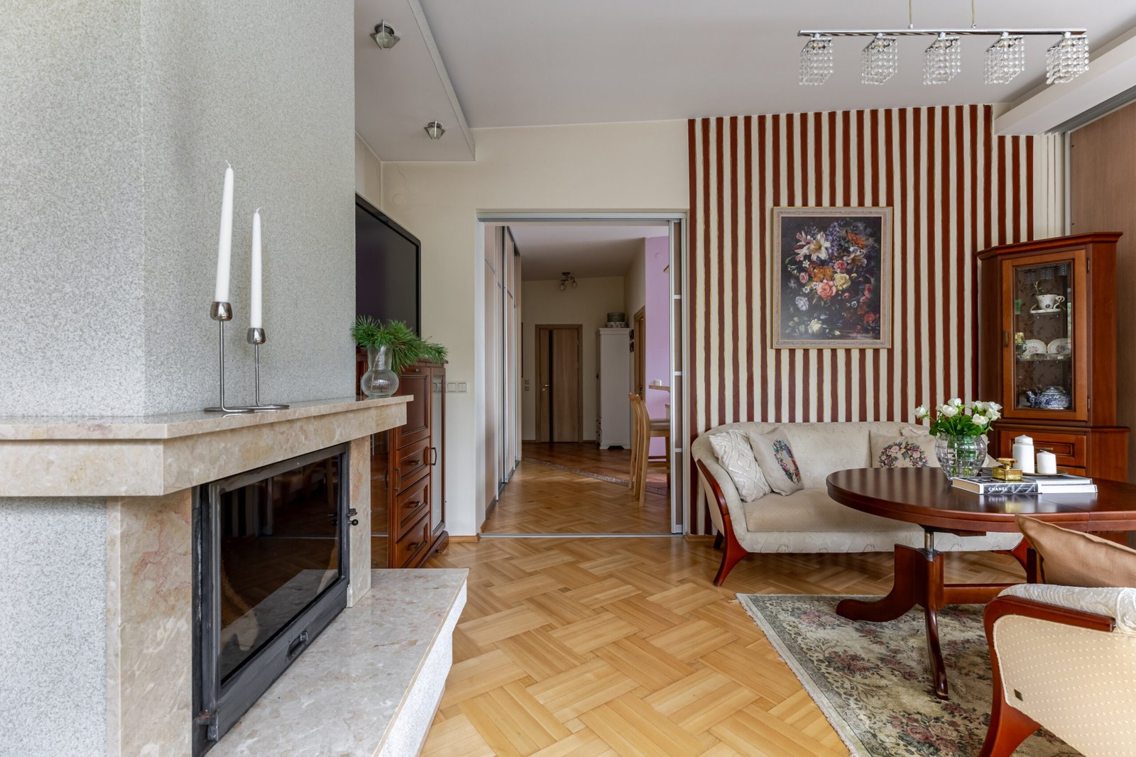 Svetainėje – židinys su natūralaus akmens apdaila ir klasikiniai baldai, patiks kokybės ir ilgaamžiškumo mėgėjams.