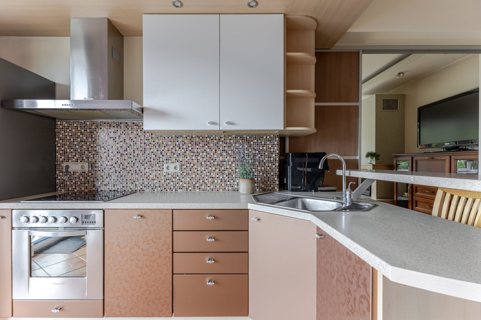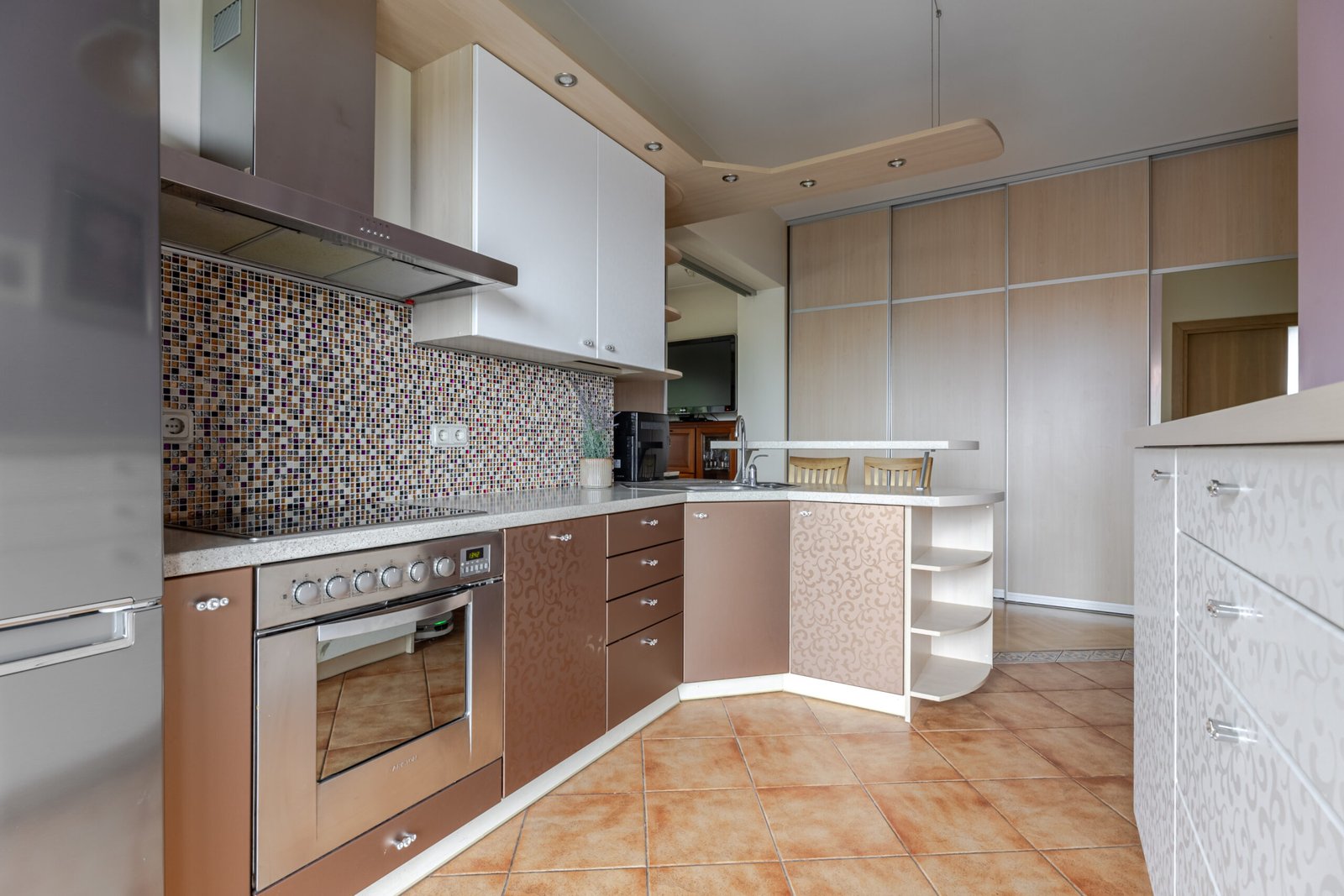 Virtuvėje – pastatyta ir įmontuota LG, Siemens buitinė technika, yra indaplovė.