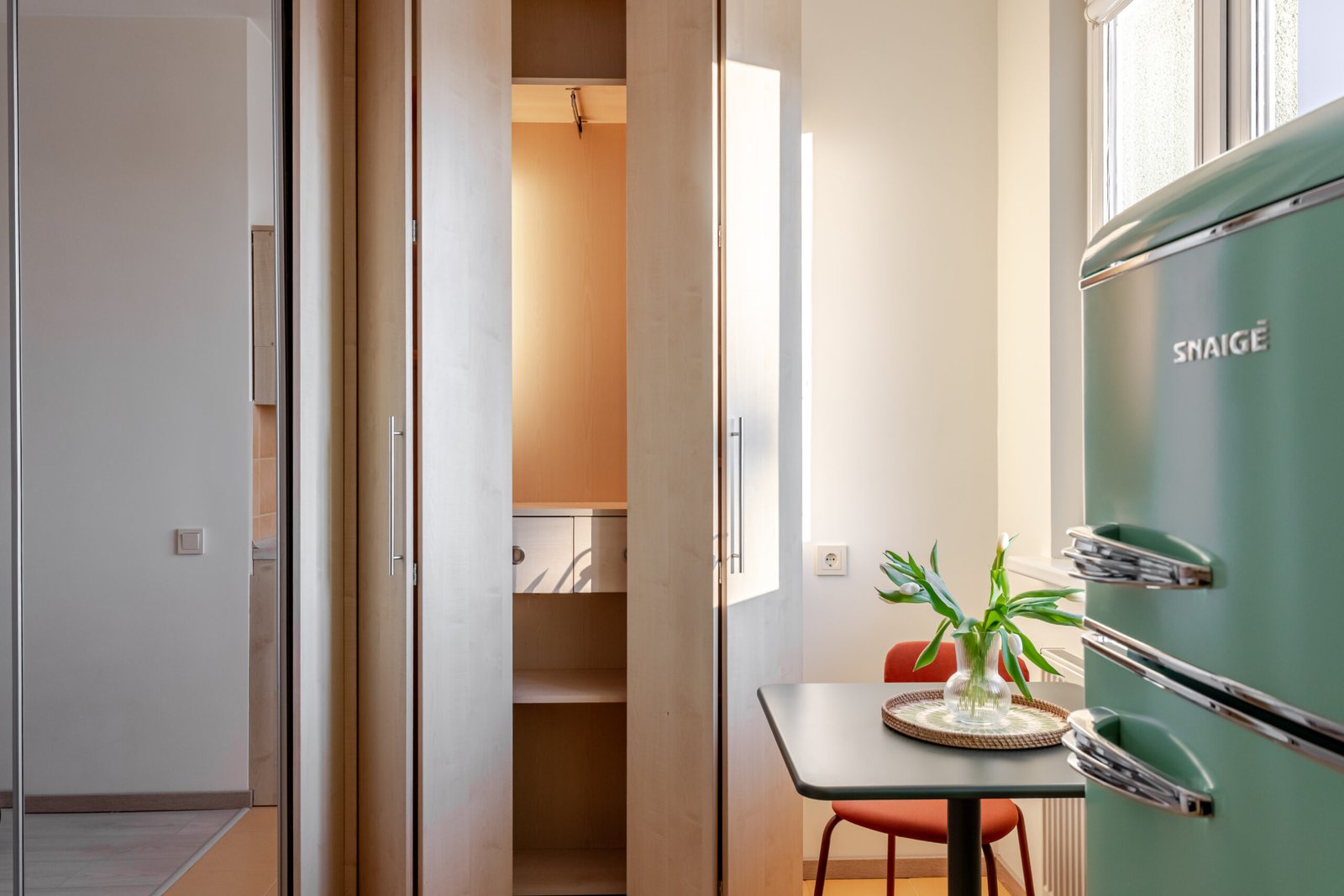 Funkcionalus išplanavimas leidžia patogiai atskirti virtuvės zoną ir svetainę–miegamąjį, o pietų kryptimi orientuoti langai visą dieną užlieja erdves natūralia šviesa. Pro langus tolumoje atsiveria vaizdas į žalią mišką, todėl čia juntama gamtos dvasia, nebūdinga centriniams rajonams. Papildomos erdvės suteikia balkonas bei sandėliukas, o automobilį galėsite statyti bendroje aikštelėje šalia namų.